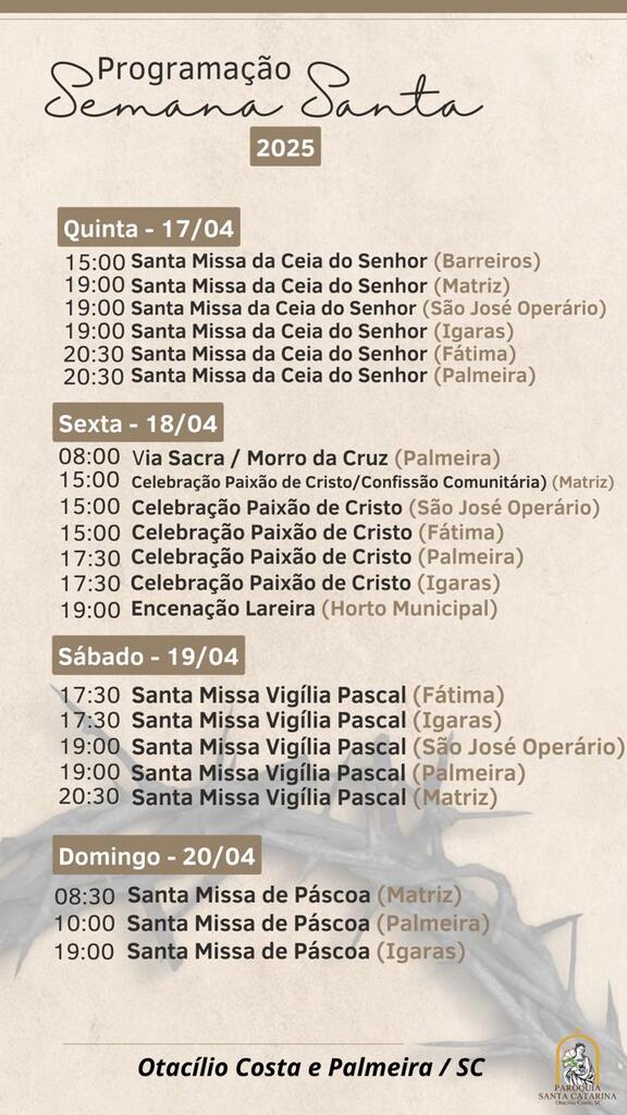 Confira na tabela toda programação da Semana Santa da Paróquia Santa Catarina: