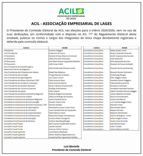 A Associação Empresarial de Lages realiza eleições na próxima segunda-feira, 30 de outubro, para escolha da nova diretoria que estará à frente da entidade no próximo triênio. Conforme previsto no estatuto, como há chapa única, a eleição será por aclamação em Assembleia Geral, em primeira chamada às 18h30min e a última chamada às 19 horas, na ACIL.