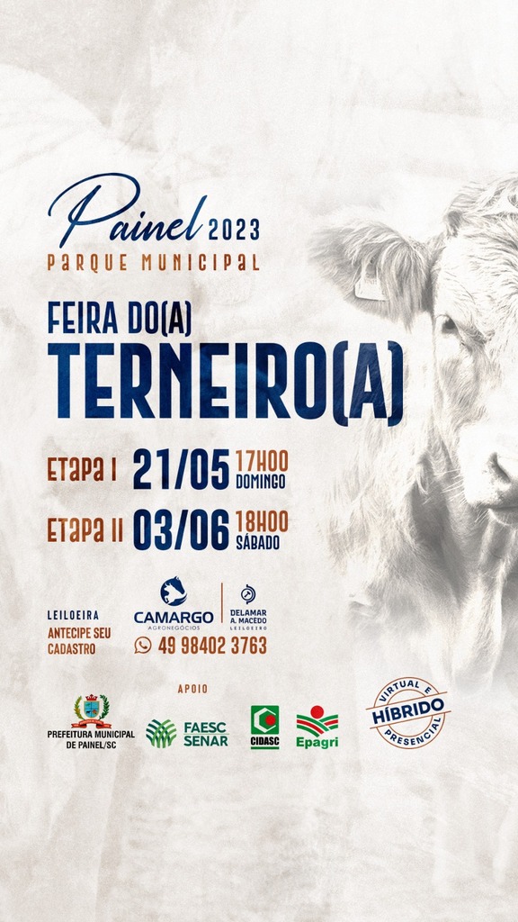 A próxima feira acontecerá em duas etapas a primeira dia 21/05 a partir das 17h no parque de exposições de Painel e a 2ª etapa dia 03/06 a partir das 18h no mesmo local.