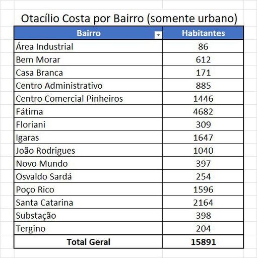 O Instituto Brasileiro de Geografia e Estatística (IBGE) divulgou, recentemente, o resultado populacional por bairro em Otacílio Costa.