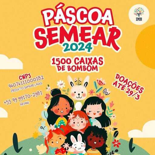 A comarca de Lages, na Serra, é parceira do projeto Semear na campanha de arrecadação de caixas de bombons para serem distribuídos aos alunos e crianças que vivem em bairros carentes da cidade durante a páscoa. A caixa coletora está na entrada principal do prédio e ficará à disposição dos servidores, magistrados e público externo até o dia 29 de março.