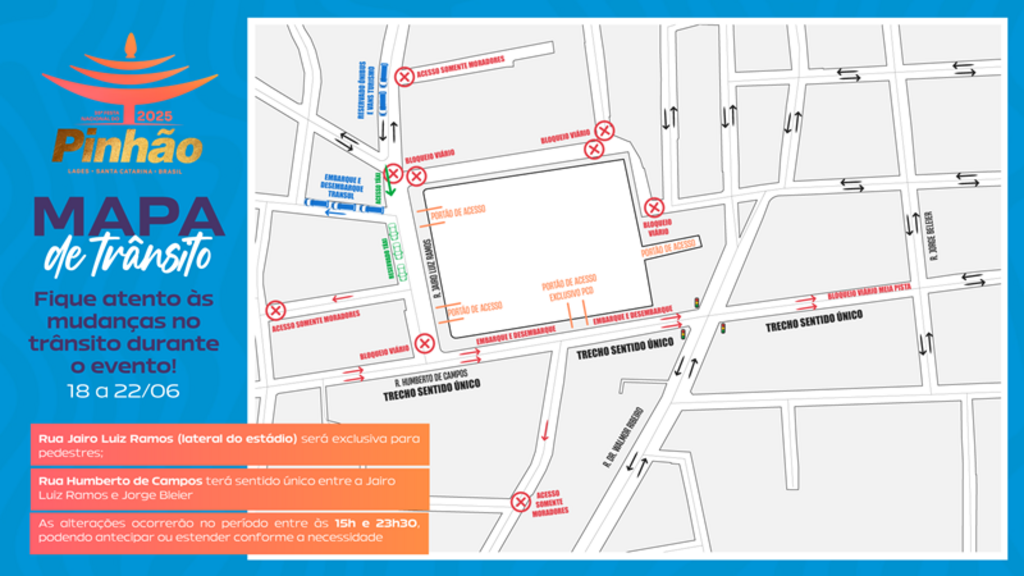 A Diretran de Lages, através da Secretaria Municipal do Planejamento Urbano (Seplam), divulgou o plano de mobilidade para os cinco dias de festa no estádio. A sinalização temporária instalada precisa de atenção dos motoristas e as alterações visam garantir maior fluidez do trânsito, organização nas vias e segurança durante o evento.