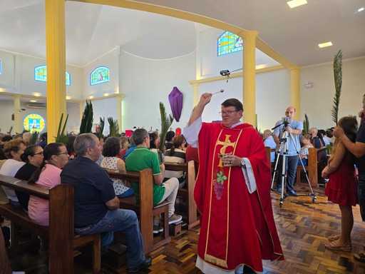 A celebração foi presidida pelo pároco, padre Darci Sá, que conduziu o momento litúrgico lembrando a entrada triunfal de Jesus em Jerusalém, simbolizada pela bênção dos ramos, tradição que abre oficialmente as celebrações da Semana Santa.