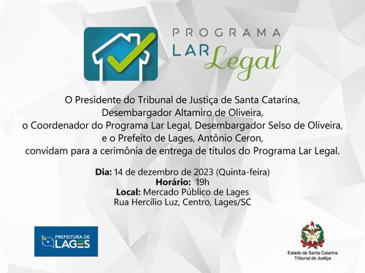 O programa Lar Legal, do Tribunal de Justiça de Santa Catarina, beneficiará moradores de Lages, na Serra Catarinense. Ao todo, serão entregues 76 matrículas de terrenos em solenidade marcada para esta quinta-feira (14/12), a partir das 19h, no Mercado Público. Na oportunidade, estarão presentes o presidente do TJ, desembargador Altamiro de Oliveira, representantes da prefeitura de Lages e magistrados da comarca local.