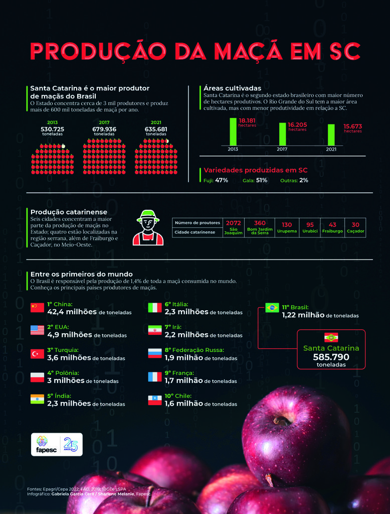 Vermelha, doce, crocante. Quem saboreia uma maçã não imagina o complexo processo produtivo por trás de uma das frutas mais queridinhas do mundo. É necessária quase uma década entre o desenvolvimento de uma muda até uma árvore adulta produzir em larga escala. Do campo até a gôndola do supermercado tem mais um longo caminho a ser percorrido. Todo esse trajeto está cercado de novas tecnologias e inovações que estão mudando a maneira de plantar, colher e processar a fruta.