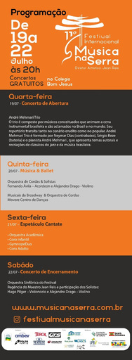 No período de 19 a 22 de julho, artistas renomados nacional e internacionalmente se apresentarão gratuitamente em concertos noturnos, no auditório do Colégio Bom Jesus, às 20 horas. E o Festival Internacional Música na Serra, já inicia com grandioso concerto de André Mehmari Trio tocando Clube da Esquina e composições próprias, no dia 19 de julho. O projeto “Na Esquina do Clube com o Sol na Cabeça” foi idealizado pelo músico André Mehmari ao lado dos músicos e amigos Neymar Dias e Sérgio Reze. Os arranjos para este concerto são inspirados nos discos mundialmente reconhecidos como marcos da música brasileira. Lages receberá através do Música na Serra, esse show que circulou pelos Estados Unidos com grande sucesso em lugares como o Lincoln Center em Nova Iorque e o Kennedy Center em Washington, passando por Quito (Equador) indo até Kyoto (Japão). O espetáculo André Mehmari Trio, em formação clássica de jazz, com piano, baixo e bateria, apresentará um repertório de composições próprias e recriações de clássicos do jazz e da música brasileira. Com muito lirismo e virtuosidade, esses três grande amigos animam a cena instrumental brasileira, são aclamados no Brasil e no mundo, e agora estarão em Lages. ........................................................ O Festival Internacional Música na Serra tem como realizador o Ministério da Cultura, Governo de Santa Catarina e Instituto José Paschoal Baggio. Patrocinadores Ambev, Havan, GTS do Brasil,Tirol, Disauto e Polpa Papéis. Apoio Colégio Bom Jesus, Prefeitura Municipal de Lages através da Fundação Cultural, 6º Serra Catarina Festival de Inverno e Festival de Inverno de Lages. Mais informações: www.musicanaserra.com.br ou no Instagram @festivalmusicanaserra |