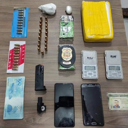 Com o investigado, na cidade de Apiúna, foram localizadas diversas munições e no interior do veículo, em um compartimento escondido, dois invólucros com substância análoga à cocaína, uma balança de precisão, um celular e R$ 946,00 em espécie.