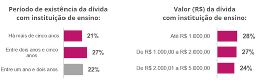Pesquisa realizada pela Serasa revela que 49% dos entrevistados já tiveram de trancar o curso por causa de dívidas com as universidades. O desemprego foi apontado por 31% dos estudantes como o principal motivo para interromper os estudos, seguido da necessidade de priorizar o pagamento de outras contas (18%) e da redução de renda (15%).