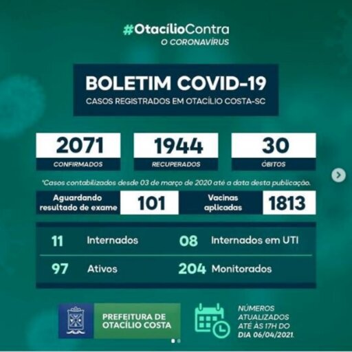 O boletim publicado hoje no Instagram da Prefeitura Municipal, mostra que o número de casos ativos de covid-19 em Otacílio Costa caiu comparado ao informativo publicado na segunda-feira (5). Nessa terça-feira (6), a Capital da Madeira registrou 97 casos ativos, 21 casos a menos comparando à última postagem.
