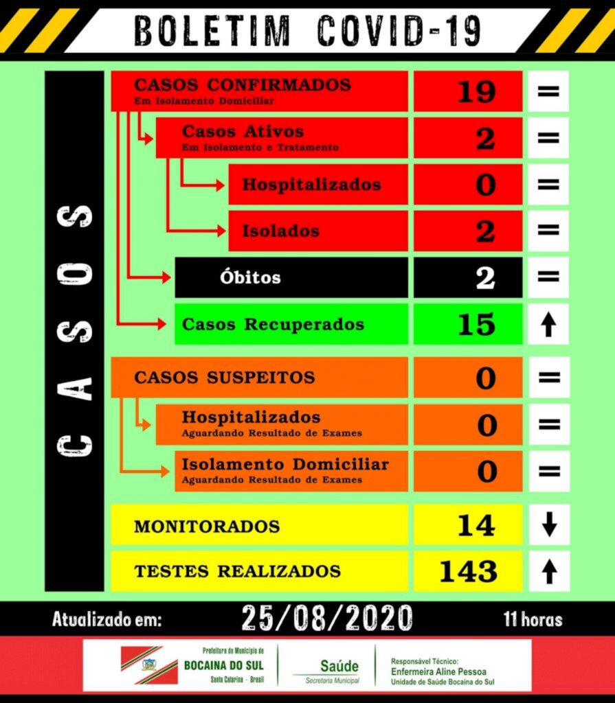 A cidade de Bocaina do Sul registra duas mortes pela covid-19 e 19 casos da doença, conforme atualização da Secretaria de Saúde do município, na tarde desta terça-feira, 25.