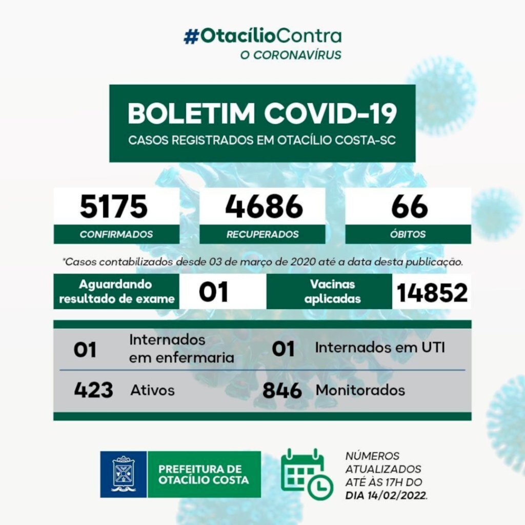 Depois de um aumento na última sexta-feira (11), o número de casos ativos de covid-19 em Otacílio Costa sofreu uma queda de 27,9% e registrou a menor quantidade de ativos desde o dia 19 de janeiro, onde o registro foi de 343 ativos. No boletim publicado nesta segunda-feira (14), o número é de 423.
