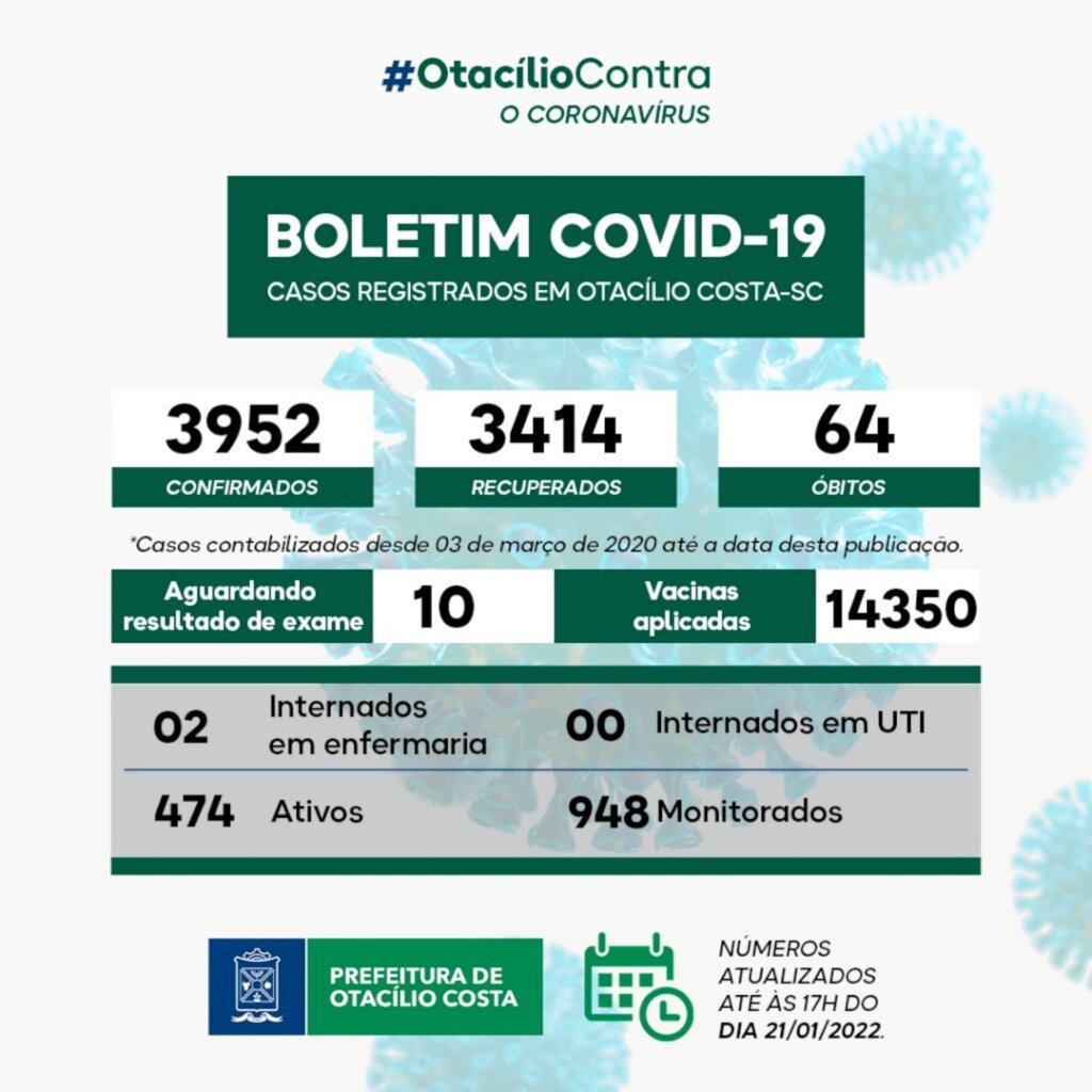 Dados da Secretaria de Saúde de Otacílio Costa, que atualizam os números da Covid-19 no município, apontam que a cidade chegou, nesta sexta-feira, 21, a um total de 474 casos ativos de Covid-19, o maior em um ano.