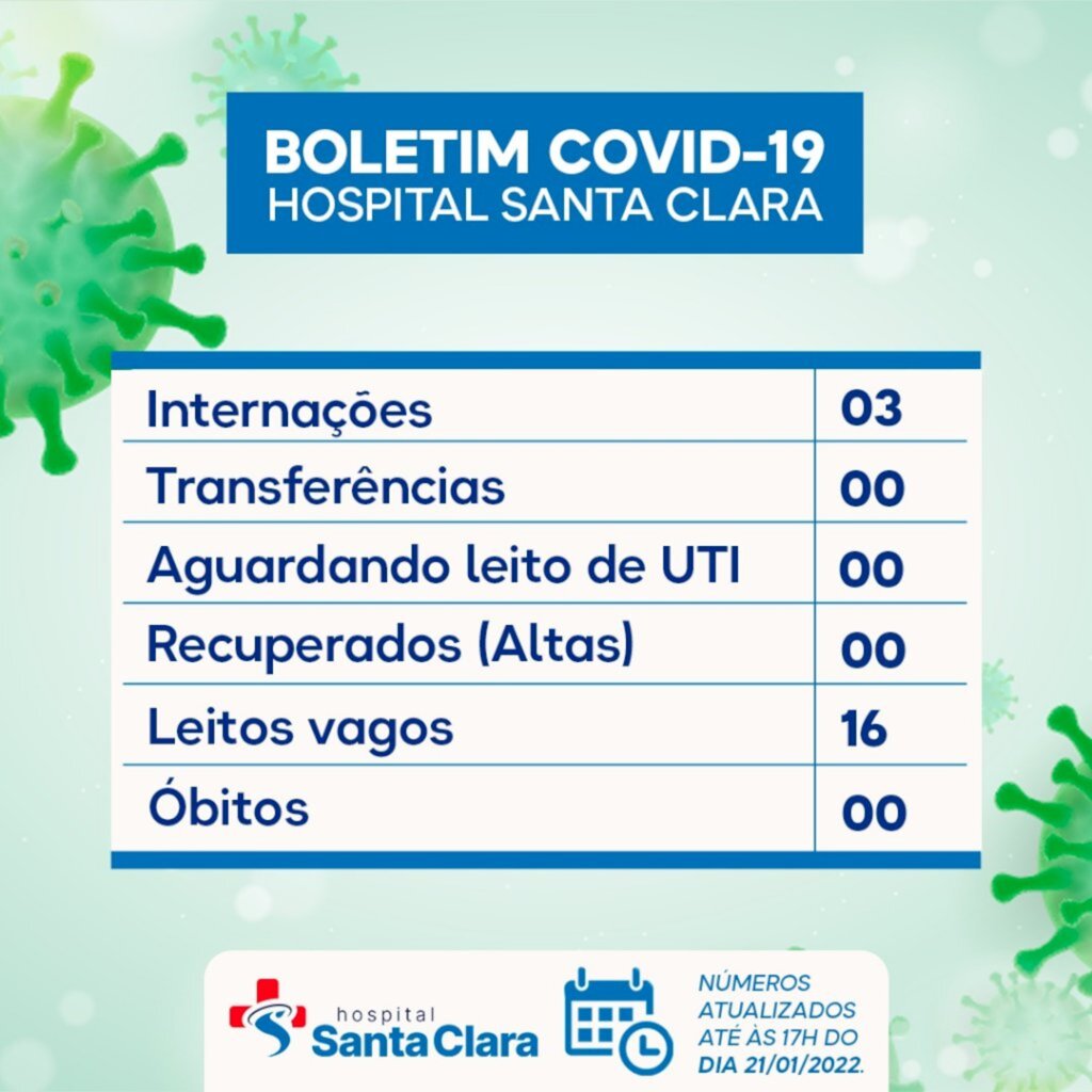 O hospital Santa Clara registrou três internações por covid-19, e no momento, está com 16 leitos vagos e nenhum óbito.