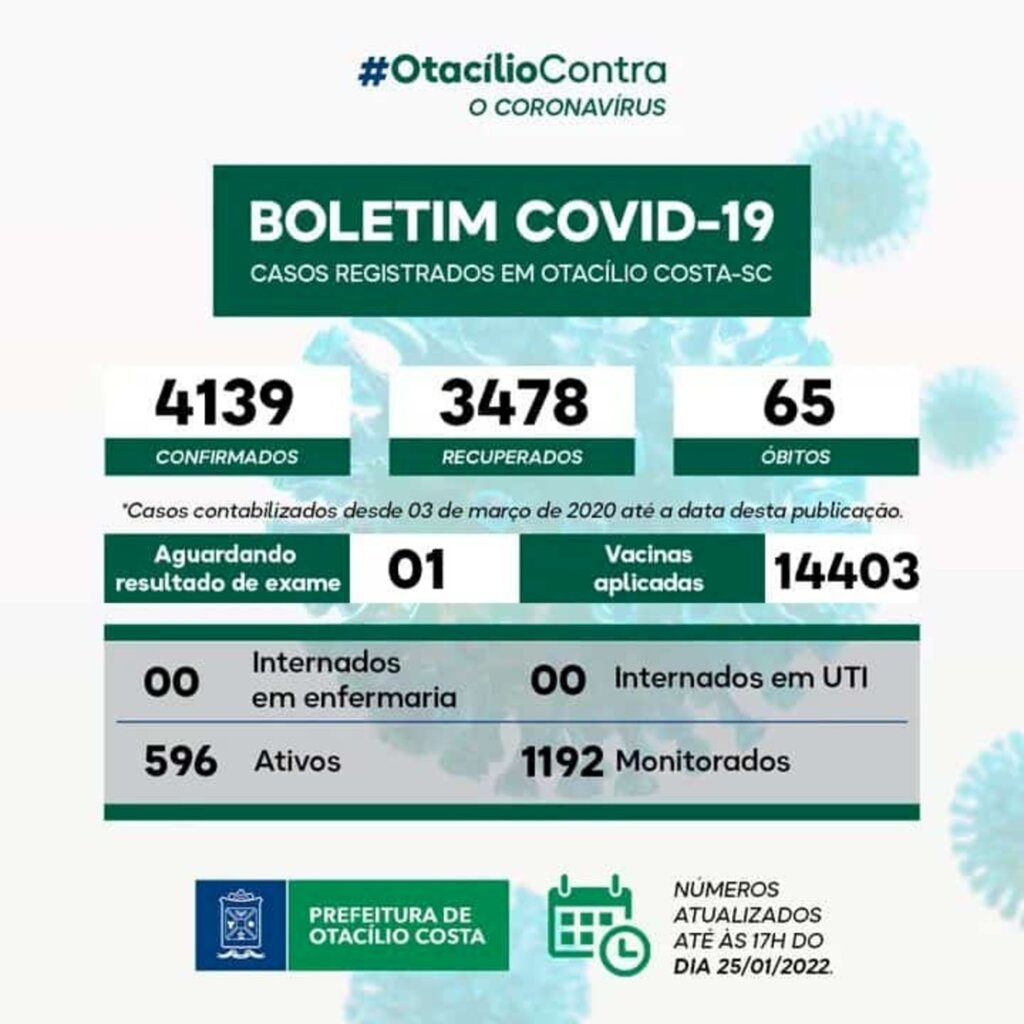 Os números da pandemia em Otacílio Costa não param de subir. Segundo o boletim publicado pela prefeitura municipal, a cidade contabiliza 596 casos ativos e 1192 monitorados. Uma pessoa aguarda resultado de exame e nenhuma está internada.