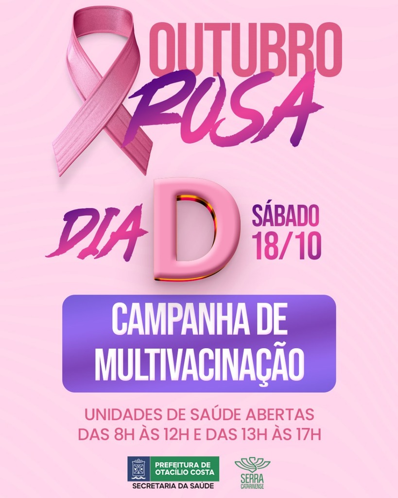 Neste sábado, 18 de outubro, a Secretaria Municipal de Saúde de Otacílio Costa realiza o Dia D da Campanha Outubro Rosa e o Dia D da Campanha de Multivacinação. Todas as unidades de saúde do município estarão abertas das 8h às 12h e das 13h às 17h, oferecendo uma série de atendimentos e serviços gratuitos à população.