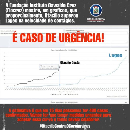 "Notem que enquanto Lages, que é recordista em casos na AMURES apresenta 29,2 confirmados para cada 100 mil habitantes, o mesmo cálculo apresenta 266,75 confirmados para Otacílio Costa. Mas você deve estar se perguntando: como assim? Otacílio Costa não tem 100 mil habitantes. Não, não tem mesmo. Mas mostra como, proporcionalmente o crescimento da transmissão e infecção de pessoas é bem mais acentuado e rápido em nossa cidade, com uma curva praticamente vertical, que representa o tão falado e temido pico. Precisamos achatar essa curva e enquanto não houver vacina", explica a prefeitura.