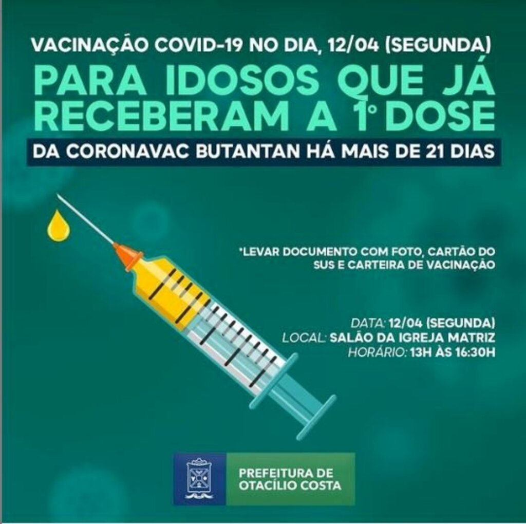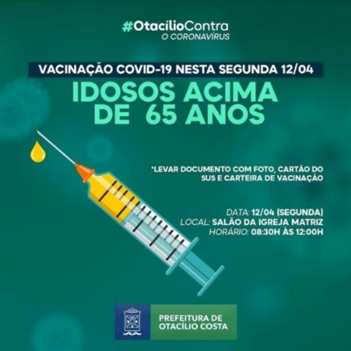 Nessa segunda-feira (12), Otacílio Costa continuará a vacinação dos idosos acima de 65 anos contra a covid-19. O procedimento ocorrerá no estacionamento do Salão da Igreja Matriz no período da manhã, das 8h30 às 12h e será no formato drive-thru, sem a necessidade de sair do carro.