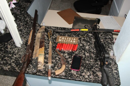 Uma espingarda de cano duplo calibre 32, uma garrucha calibre 22, uma balestra, duas facas e munições. Essas foram as armas apreendidas pela Polícia Militar, na manhã deste domingo, 17, numa ação das guarnições deslocadas para atender, inicialmente, uma ocorrência de um acidente de trânsito.