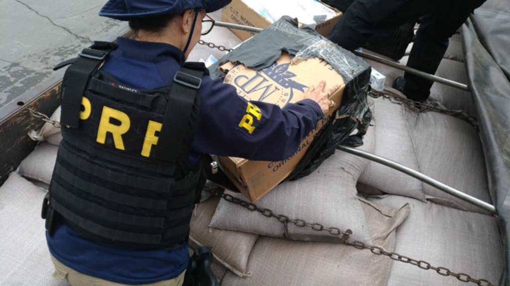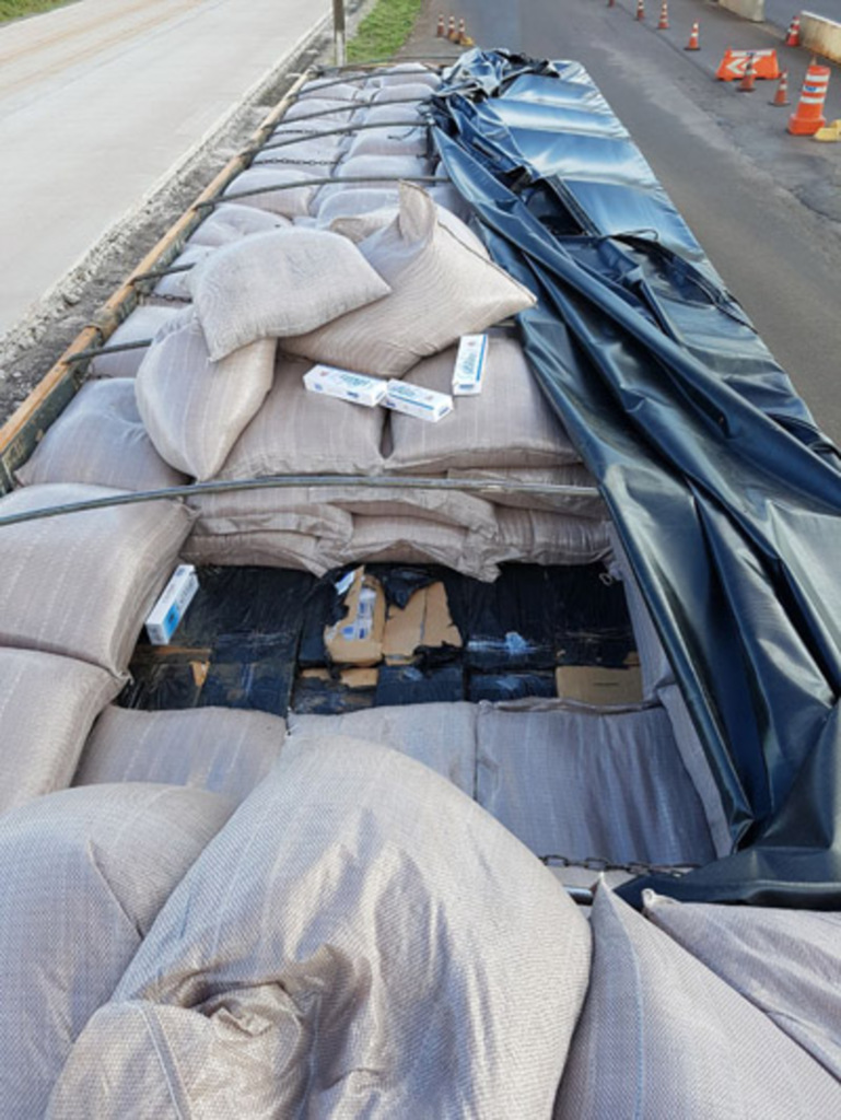 Uma carreta Scania com placas de Sarandi (PR), transportava os cigarros escondidos embaixo de uma carga de sacos de sorgo, um cereal.