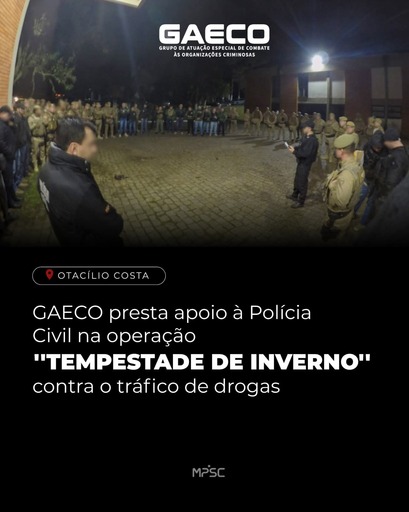 O GAECO (Grupo de Atuação Especial de Combate às Organizações Criminosas) prestou apoio à Polícia Civil de Otacílio Costa, na deflagração da operação Tempestade de Inverno, na manhã desta quarta-feira (18/6). A operação teve como objetivo reprimir o tráfico de drogas praticado por um grupo criminoso com atuação no município.