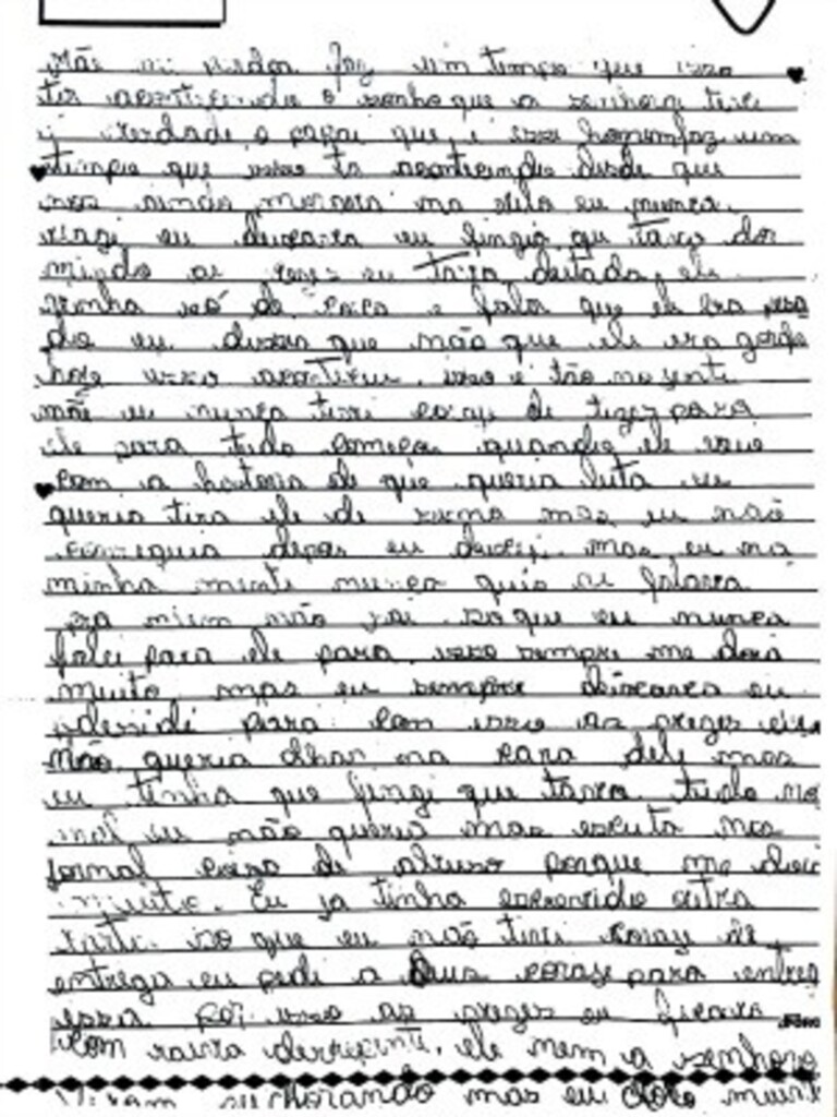 "Mãe, me perdoa. Faz um tempo que isso está acontecendo [...] hoje isso aconteceu, isso é tão nojento. Mãe, eu nunca teria coragem de dizer para ele parar. Tudo começou quando ele veio com uma história de que queria lutar. Eu queria tirar ele de cima de mim, mas eu não conseguia, depois eu deixei, mas na minha mente eu nunca quis, ele falava para eu não sair, só que me doía muito mas eu sempre deixava. [...] Eu não queria olhar na cara dele, mas eu tinha que fingir que estava tudo normal. Eu não queria mais escutar no jornal coisa (sobre) abuso porque me doía muito. Eu já tinha escrito outra carta, só que não tive coragem de entregar. Eu pedi a Deus coragem para entregar essa. Por isso eu ficava com raiva de repente, nem ele nem a senhora me viram chorando, mas eu choro muito", diz um trecho da carta.