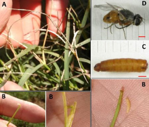 A mosca-da-grama-da-bermuda coloca seus ovos nas plantas e, quando eles eclodem, as larvas se alimentam dos perfilhos (brotações) da pastagem. "A morte das folhas apicais de perfilhos infestados é decorrente do dano no tecido vascular, que conduz a uma redução significativa no crescimento das plantas, reduzindo a produção de biomassa de forragem em áreas já estabelecidas e dificultando o estabelecimento de novas áreas com espécies vegetais hospedeiras do inseto-praga", explica Leandro.