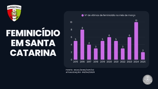 Santa Catarina alcançou um marco histórico no combate à violência contra a mulher. Dados da Secretaria de Estado da Segurança Pública (SSP-SC) mostram que o Estado registrou, no mês de março de 2025, o menor número de feminicídios dos últimos dez anos: foram duas vítimas, contra dez no mesmo período de 2024, o que representa uma redução de 80%.