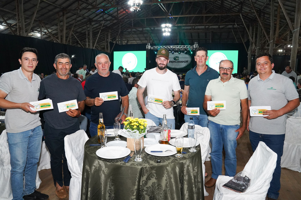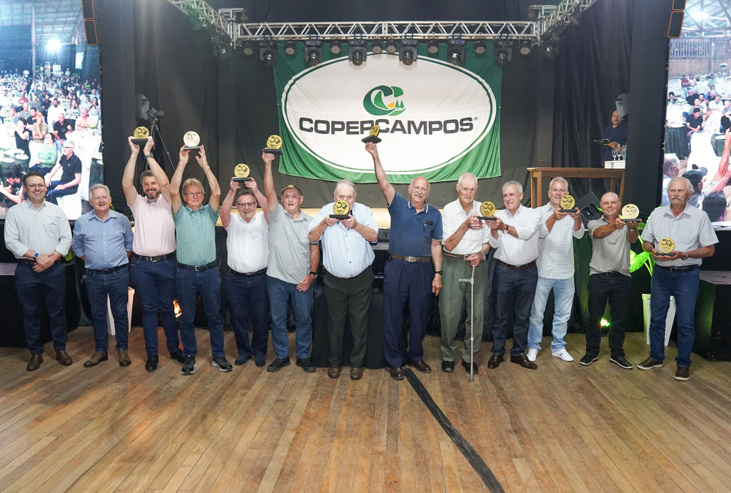 Homenagem aos associadosDurante o jantar de encerramento do Programa de Bonificação de Sementes, a Copercampos prestou uma homenagem especial a um grupo de associados que, há 50 anos, contribui de forma decisiva para a construção da qualidade e da credibilidade da produção de sementes na cooperativa.A homenagem reforçou a importância histórica desses sementeiros, que participaram ativamente da evolução tecnológica, da ampliação da área cultivada e da consolidação da cooperativa como referência nacional em sementes certificadas de soja. “Ao longo de cinco décadas, esses produtores acompanharam transformações no campo, investiram em inovação e mantiveram o compromisso com a excelência, contribuindo para que a Copercampos se tornasse um dos principais nomes do segmento”, ressalta o Diretor Superintendente Lucas de Almeida Chiocca.Foram homenageados: