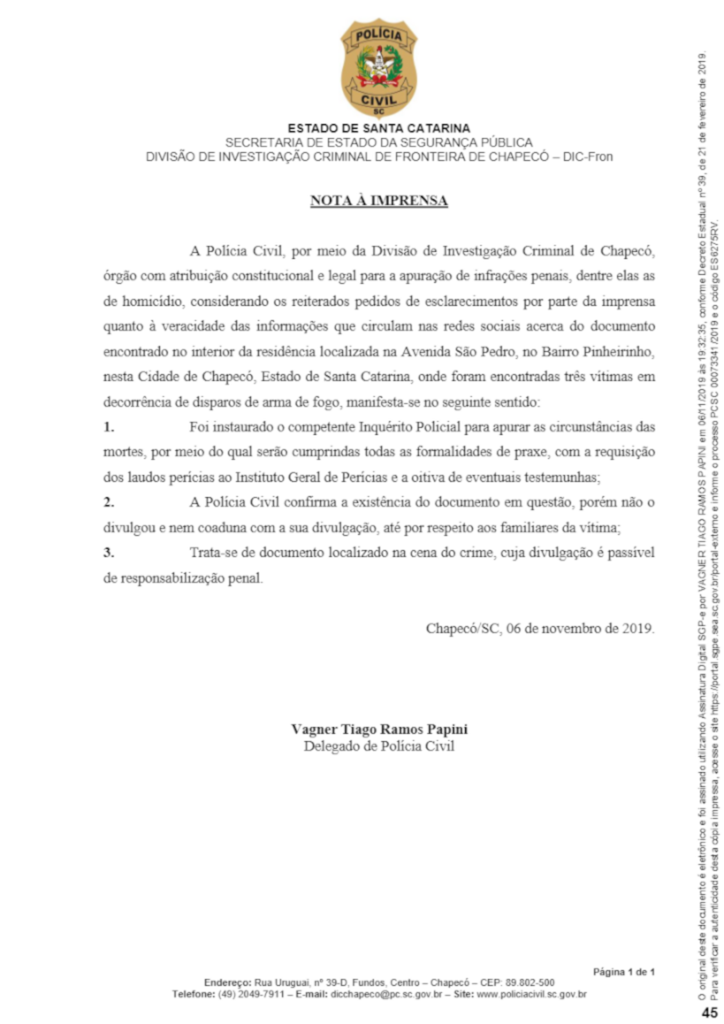Agora a Polícia Civil assume as investigações que deverá apontar as reais causas desse crime bárbaro que chocou Chapecó.