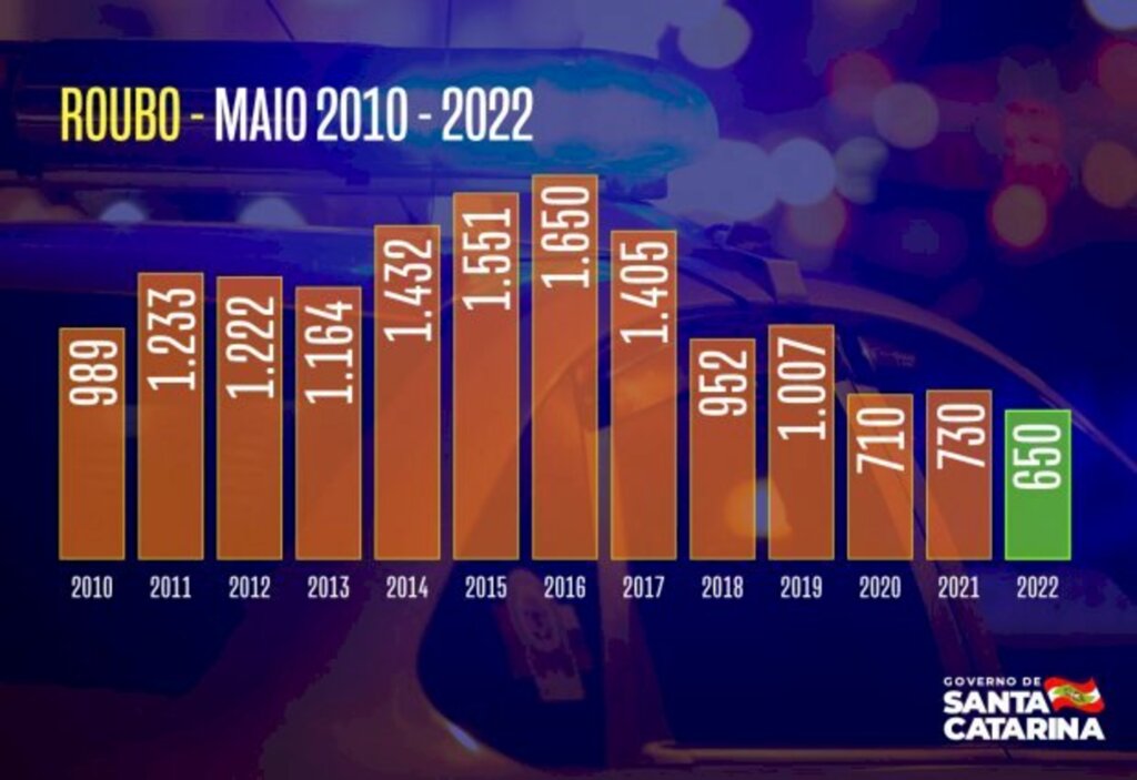 Também em maio, foi registrado o menor número de roubos para o mês da série histórica. Na comparação com 2016, a redução é de 60% - de um total de 1.650 para 650. Os dados são do Colegiado Superior de Segurança Pública e Perícia Oficial. Segundo o governador Carlos Moisés, os índices atuais são consequência de duas situações: o trabalho integrado das forças de segurança e o maior investimento no setor na história do estado.